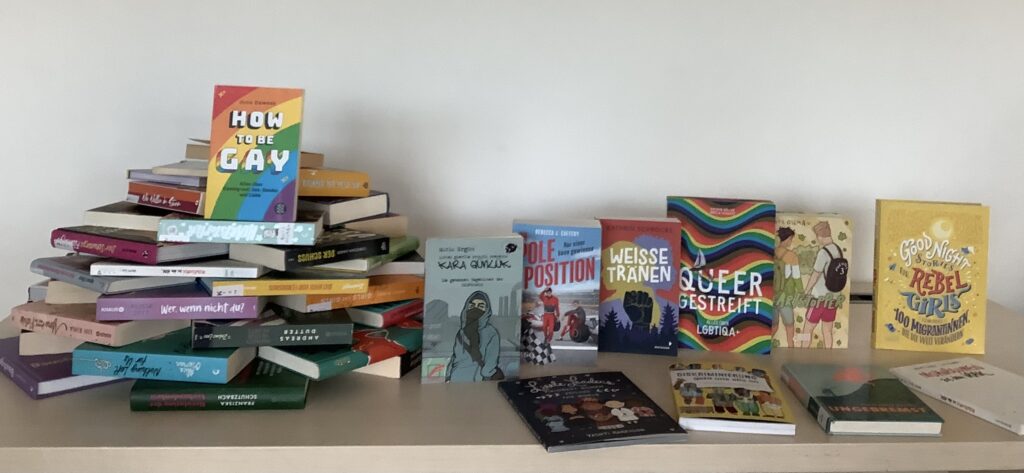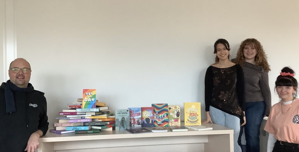 Eine buntere, vielfältigere Schulbibliothek, in der sich möglichst alle Schüler*innen wieder finden – unabhängig von sexueller Orientierung, Hautfarbe, Geschlecht, Identität, Behinderung, Herkunft … Der Umsetzung dieser Projektidee sind wir nun ein Stück näher gekommen: Dank einer Förderung durch Care Deutschland e.V. und Bücherspenden verschiedener Verlage konnten Frieda, Hanna und Herr Mönning 60 neue Bücher für alle Altersgruppen für die Bibliothek an Frau Eisenmeier übergeben, die ab Januar im neuen Diversity-Regal stehen und ausgeliehen werden können. Kommt vorbei!